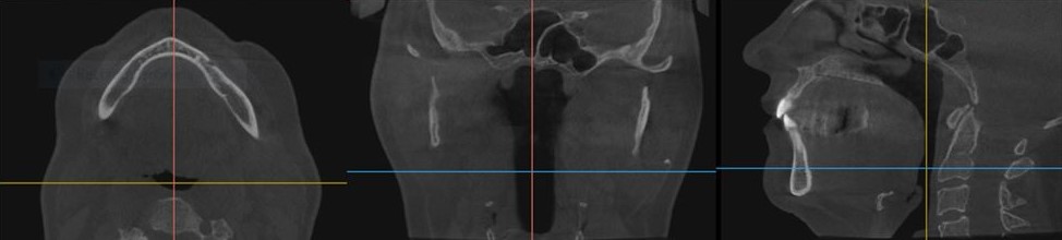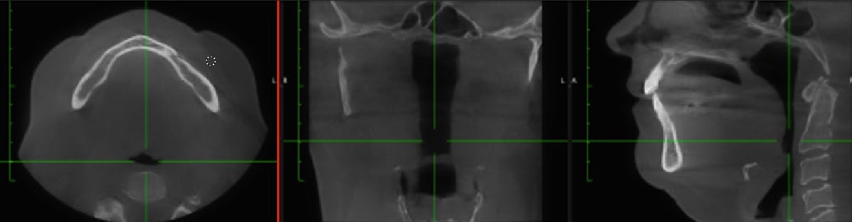 Home sleep apnea testing reported an AHI of 41.7 events/hour, with a supine AHI of 51.9 events/hour, an oxygen saturation nadir of 81%, and a respiratory disturbance index of 42.1. Radiologic interpretation of the CBCT confirmed a deviated nasal septum, severe oropharyngeal narrowing at the level of the soft palate and posterior third of the tongue, and lingual tonsillar hypertrophy. Cervical spine imaging also demonstrated intervertebral foraminal stenosis at levels C3–C5 and joint space narrowing—findings consistent with chronic forward head posture and its biomechanical consequences.32-35