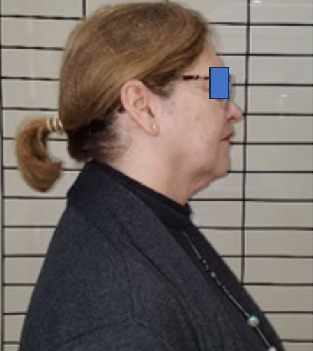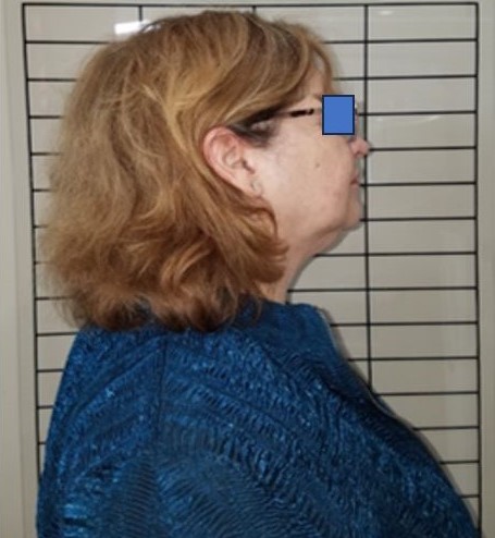 The patient exhibited FHP (Figure 13), with the external auditory meatus positioned approximately 7 cm anterior to the vertical line aligned with the acromion and cervical spine. This measurement was obtained using plumb line and photographic postural analysis, a validated method for evaluating craniovertebral angle and sagittal head deviation.33
