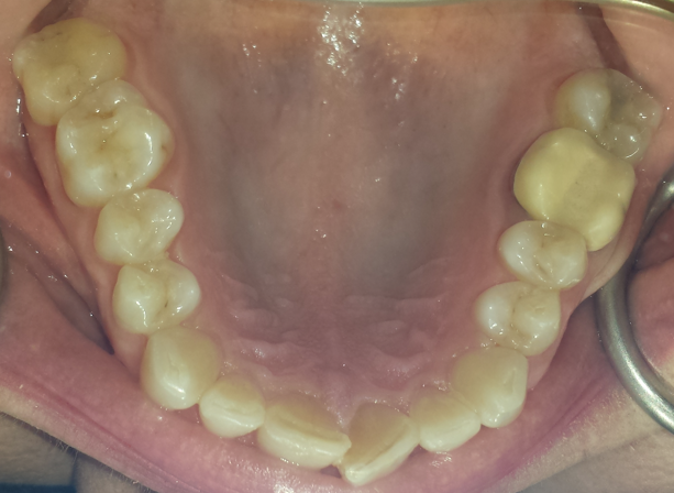 Initial cone beam computed tomography (CBCT) revealed low tongue posture (Figure 1). Figures 2, 3, and 4 show the frontal, maxillary occlusal, and mandibular occlusal views of the dentition, respectively. Clinical examination identified a scalloped tongue with low muscle tone and difficulty achieving palatal suction. Dental findings included upper and lower arch crowding, advanced tooth wear consistent with attrition, a deep skeletal bite evident on cephalometric analysis, and a marked loss of vertical dimension of occlusion (VDO) (Figures 5 and 6).