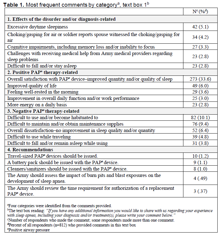 This study evaluated U.S. Army soldiers’ comments regarding OSA using an inductive approach to thematic analysis. Categories among the comments were identified including positive and negative treatment-related comments, effects of the disorder and/or diagnosis, and recommendations. The most prevalent comments in each category were presented.