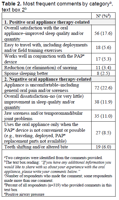 The most common negative oral appliance comment, reported by 22.6% (n=72) of respondents, described the appliance as uncomfortable, including general oral pain and/or soreness. Other common negative comments included overall dissatisfaction, with no (or very little) improvement in sleep quality and/or quality, jaw soreness, use of the appliance only when the PAP device is not convenient (e.g., during travel or deployment), and teeth shifting and/or altered bite (Table 2).
