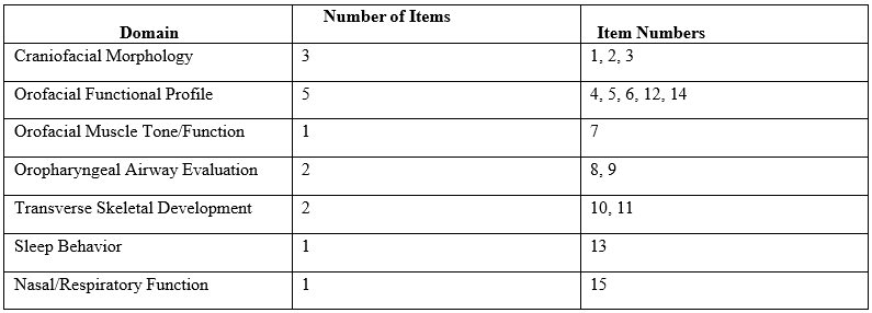 This study was undertaken to create a domain-level classification system for the FAirEST-15 items through expert consensus from three specialties—pediatric dentistry, orthodontics, and pediatric ENT—and to evaluate the content validity of these domain assignments using standard indices such as the content validity index (CVI), content validity ratio (CVR), and interrater agreement (IRA).