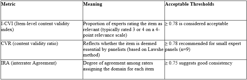 The strength of the current validation process lies in its quantitative rigor (using I-CVI, CVR, and IRA), combined with qualitative consensus, which enhances the content credibility of the proposed domains. The high agreement scores observed (most I-CVI, CVR, and IRA values ≥ 0.78) indicate a strong consensus among experts about the categorization, suggesting high content validity.