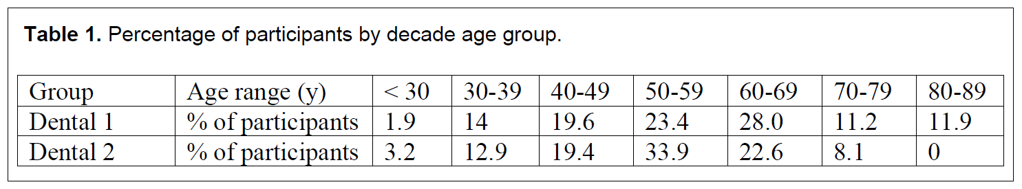 For dentist group 1, there were 110 participants who started the survey, of whom three failed to reach the halfway point and were considered to have dropped out. This left 107 participants included in the study. The age range in participants was 53.6 years (range 27–86) and average years in dental practice was 26.8 (range 0–68), where 74.2% were general dentists and 57.8% received their degree in dentistry in California dental schools.