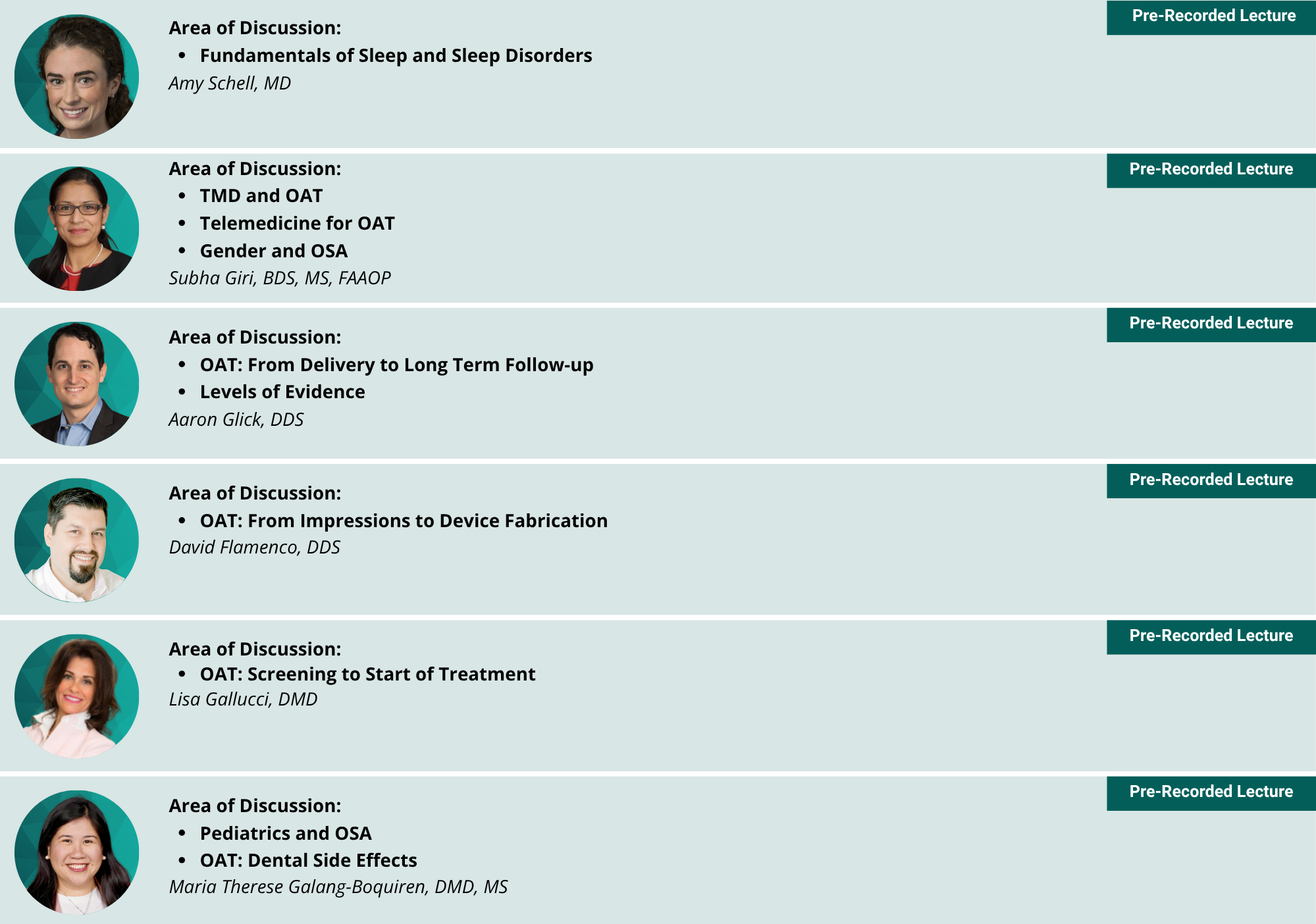 The Virtual Board Review Course is an organized overview of dental sleep medicine and sleep medicine. Material is presented through eight hours of a pre-recorded question and answer format for the purpose of preparing dentist candidates for the ABDSM examination. The course is taught by an expert faculty at the forefront of sleep medicine and dental sleep medicine. Topics covered mirror ABDSM examination content areas. Two, 1.5-hour, live Q&A sessions with faculty and recommended reading study club sessions are also included in the course.