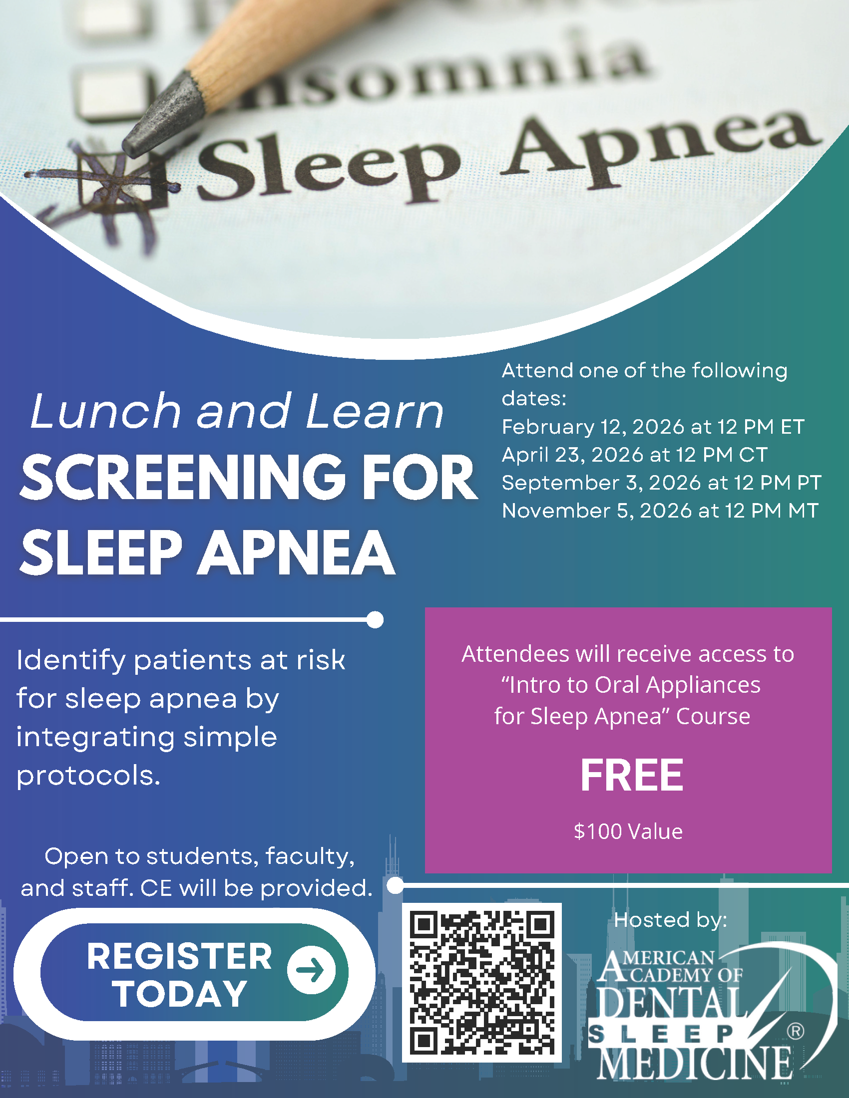The AADSM will host free quarterly Lunch & Learn webinars titled “Screening for Sleep Apnea: From Chairside to Bedside.”