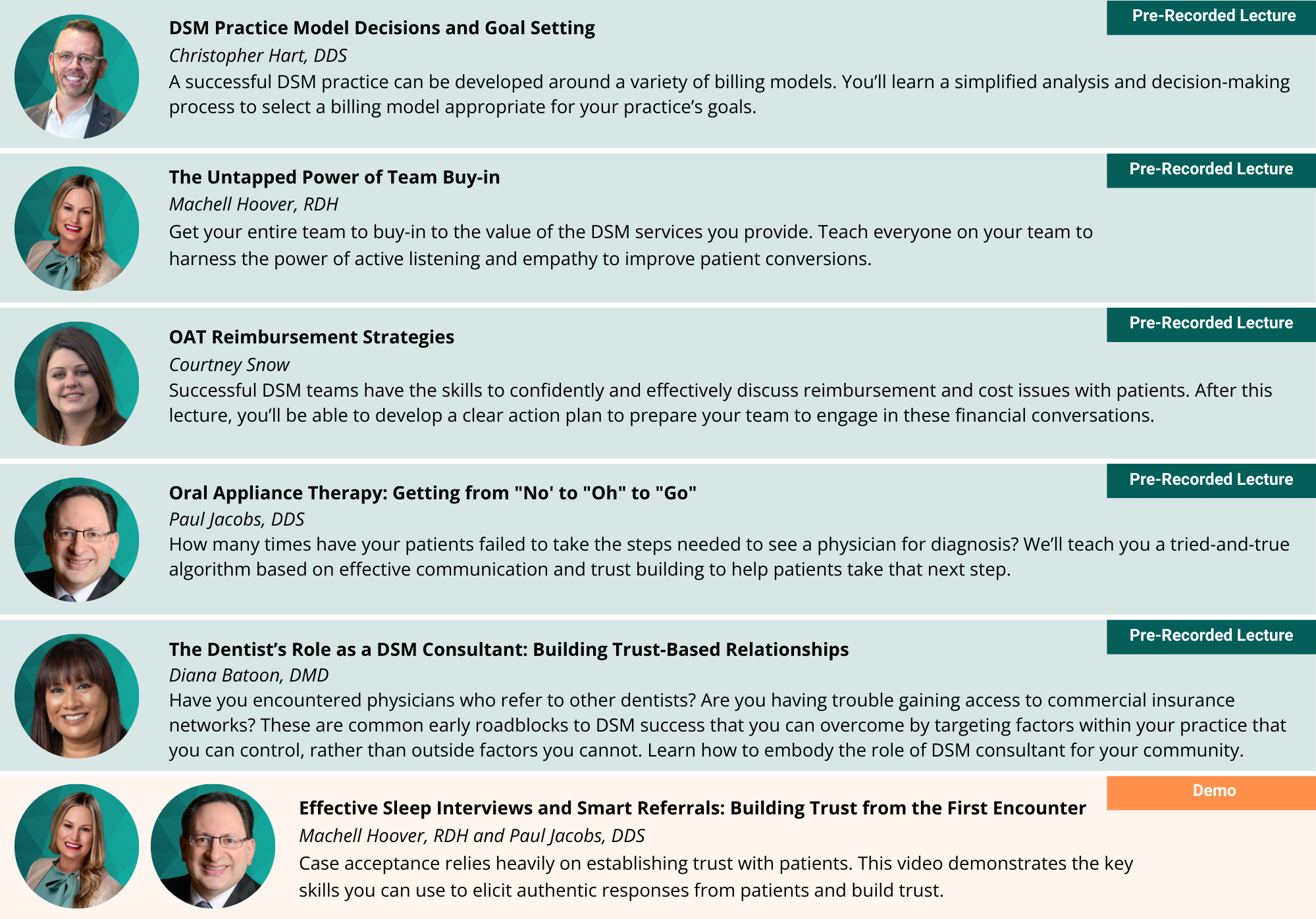 While not required, it is strongly encouraged that dentists complete the AADSM Mastery Program and team members complete the DSM Team Training Program prior to registering for Practice Management On Demand.