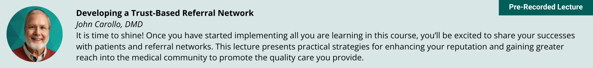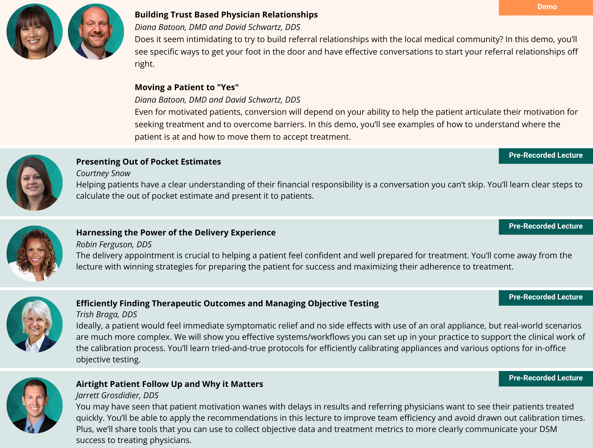 Presentations are comprised primarily of 10-minute to one-hour lectures and demos to ensure that the information is provided in short, digestible pieces that can be easily referenced as dentists and team members apply their knowledge in practice.