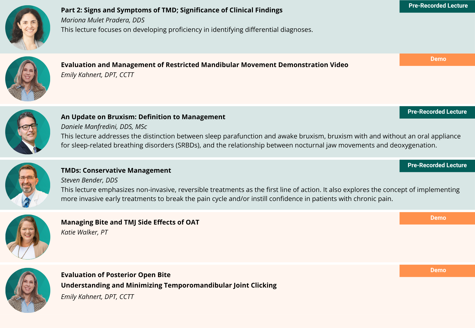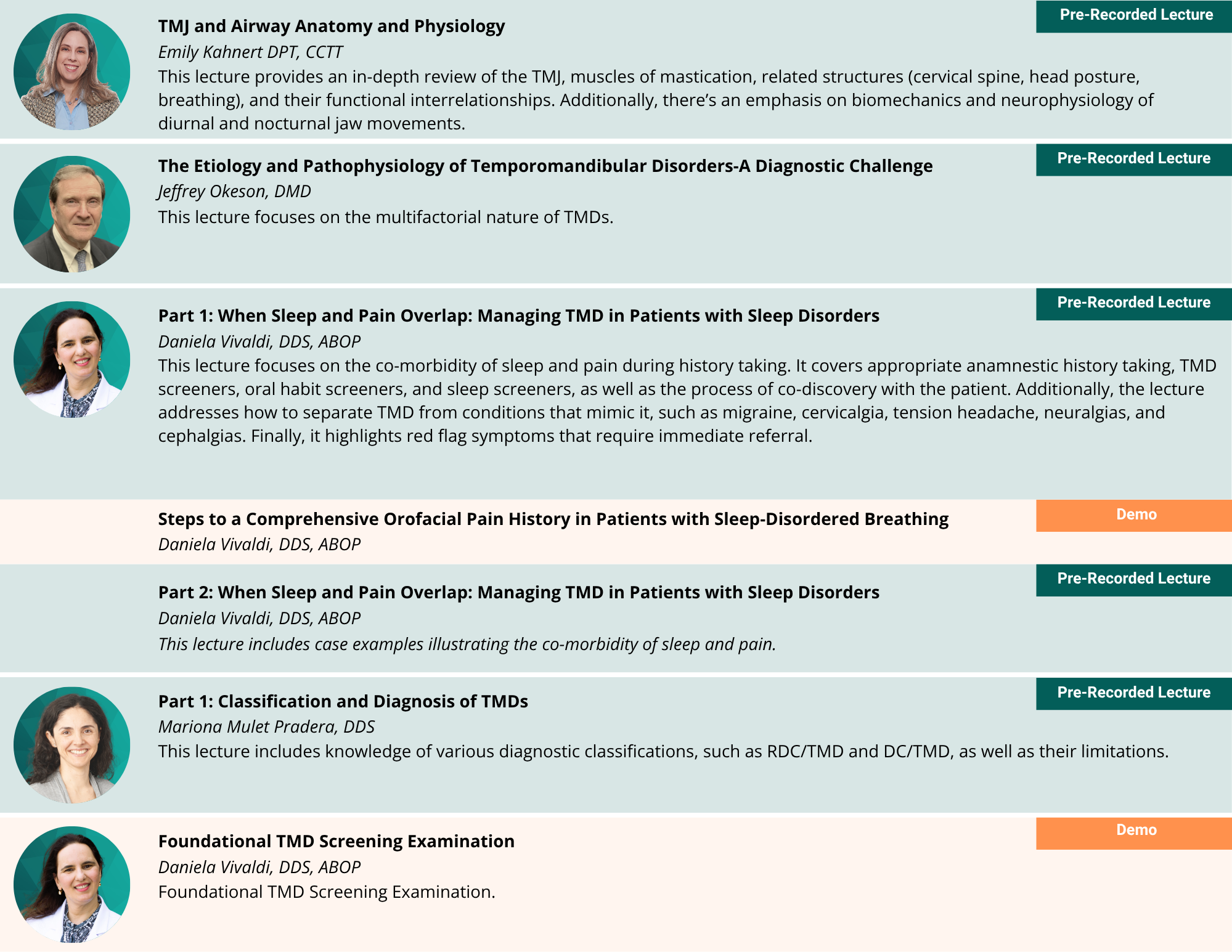 Registration for the workshop includes access to 12.75-hours of online pre-recorded lectures and demonstration videos that provide foundational and clinically practical knowledge on the relationship between oral appliances for OSA and TMD. Attendees are strongly encouraged to listen to the recordings prior to attending the in person workshop. The following is an outline of what is included in the pre-recorded content.
